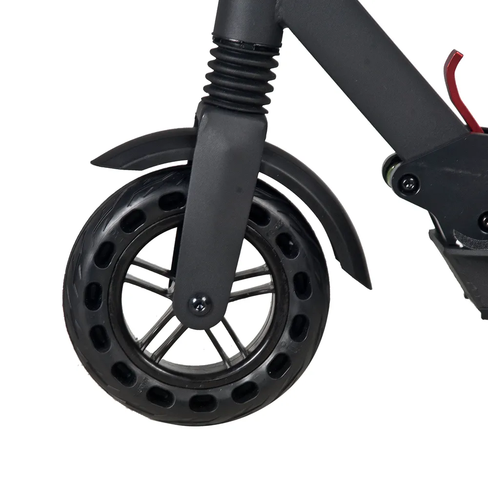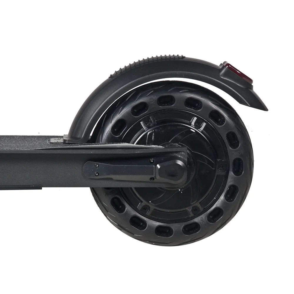 Самокат оснащен электромотором мощностью 350 Вт и аккумулятором емкостью 6А*ч, которые допускают развитие скоростных характеристик до 25 км/час и максимальную дальность хода до 20 км. Передние и задние колеса размером 8 дюймов изготовлены из нестираемого долговечного материала, накатистые. Торможение проводится с помощью заднего ножного тормоза. Противоскользящая дека увеличивает степень безопасности техники, исключает случайное соскальзывание стоп.