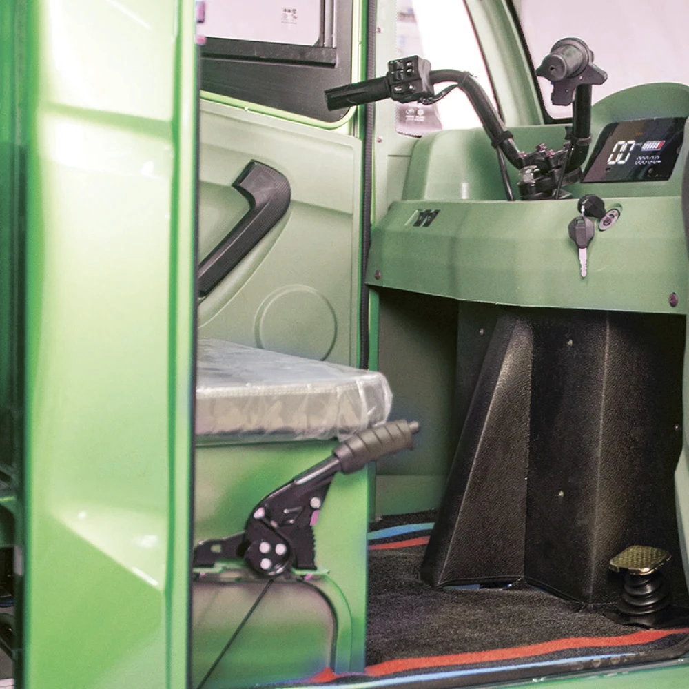 Модель оснащена современным тяговым бесщеточным новым мощным мотором с параметрами 1000 Вт. Такая начинка улучшает скоростные характеристики техники. Электротрицикл быстро развивает скорость до 25 км/час. Откидные борта кузова позволяют легко выгружать крупногабаритный груз. Герметично закрытая кабина допускает езду при любых погодных условиях, открывается с двух сторон.