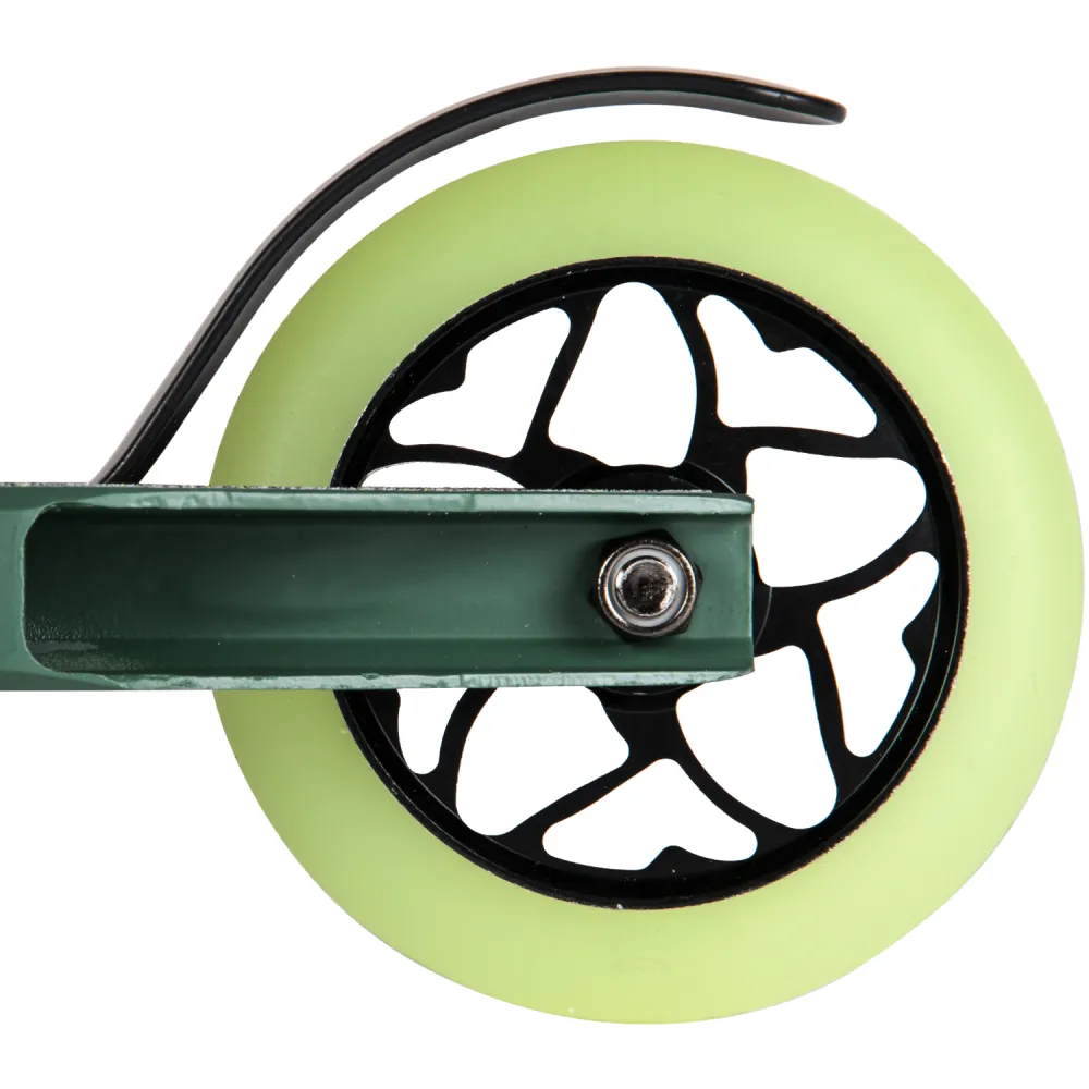 Производитель гарантирует надежность сборки, используя только фирменные детали. Повышенная комфортность техники обеспечивается благодаря удобной рулевой части. Резиновые накладки на руль самоката надежно закреплены. Имеют анатомически правильную форму, не скользят под руками. Трюковой самокат весом 3,75 кг позволит ощутить легкость передвижения и исполнения трюков. Приемлемая цена делает модель доступной для начинающих райдеров. Абсолютная безопасность самоката обеспечивается благодаря качественным задним ножным тормозам. Колеса диаметром 110 мм из прочного полиуретана позволяют прочно сцепляться с любой дорожной поверхностью.
