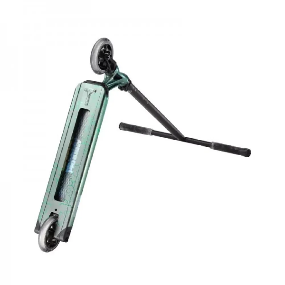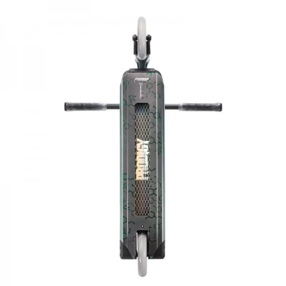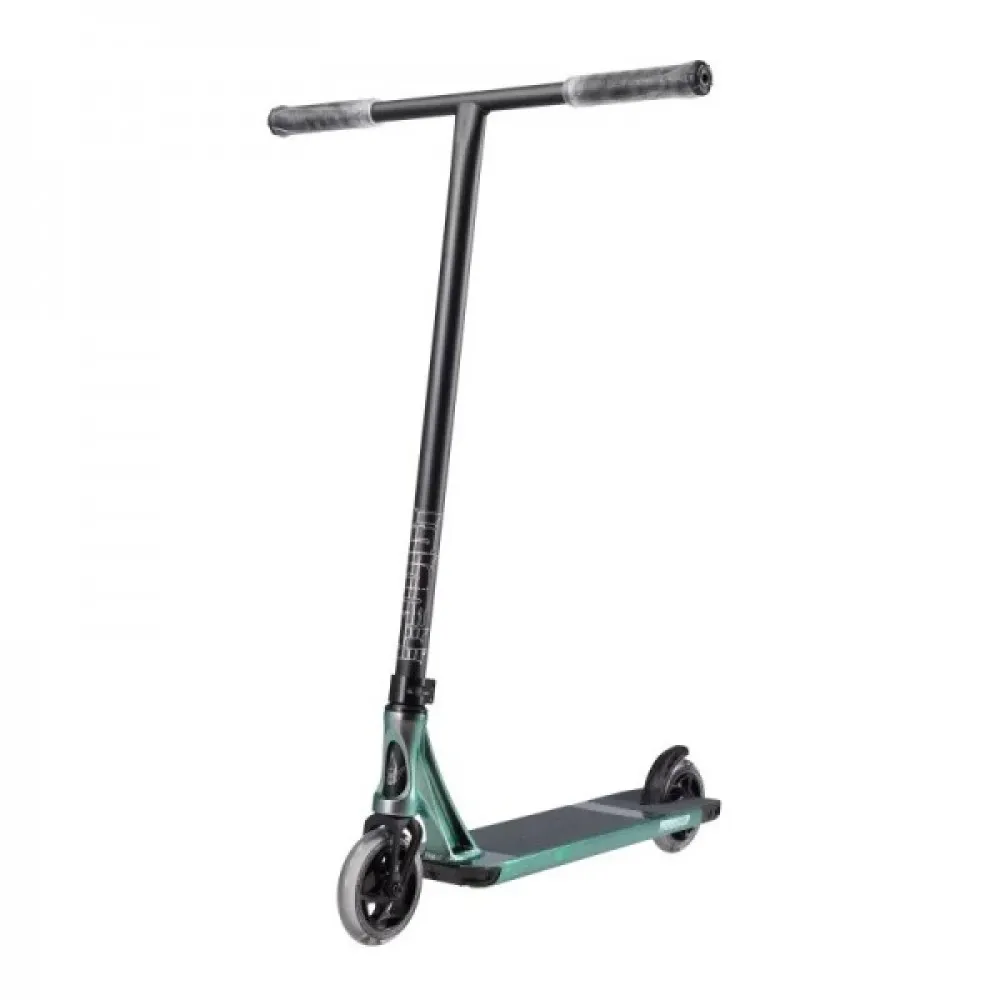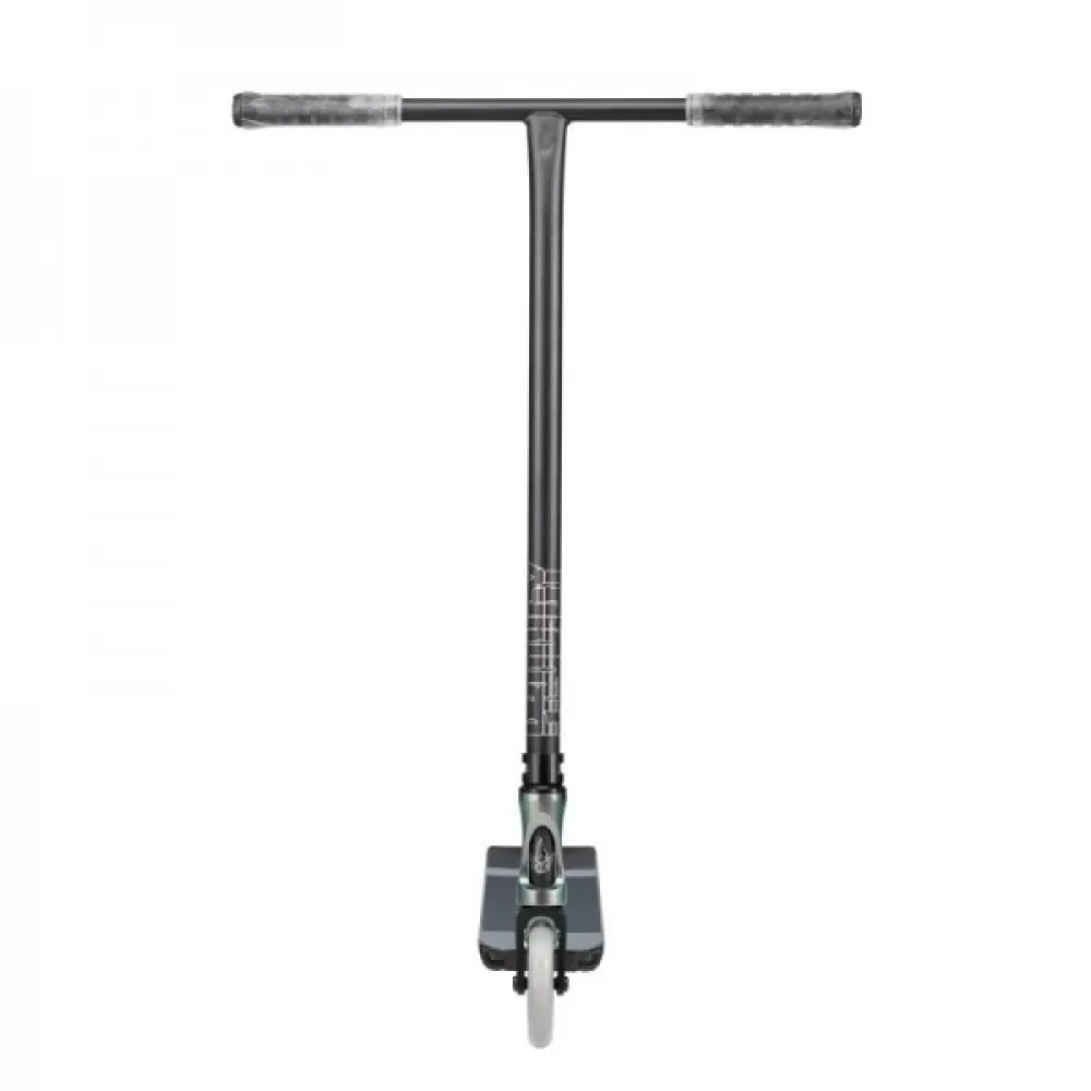 Конструкция самоката изготовлена из облегченного инновационного алюминия, благодаря которому вес составляет 4 кг. Прочность и надежность, устойчивость к механическим нагрузкам подтверждена многочисленными отзывами продвинутых трюкачей. Колесная часть изготовлена из качественного полиуретана, имеет размеры 120 мм с параметрами жесткости 86 А и инновационными подшипниками обещают максимальный накат, важный для трюкачества. Широкая дека покрыта брендовой среднезернистой шкуркой. Рулевая часть удобная по высоте, оборудована анатомическими удлиненными грипсами, гарантирующими максимальный хват. Крепится специальным хомутом с 2 болтами.