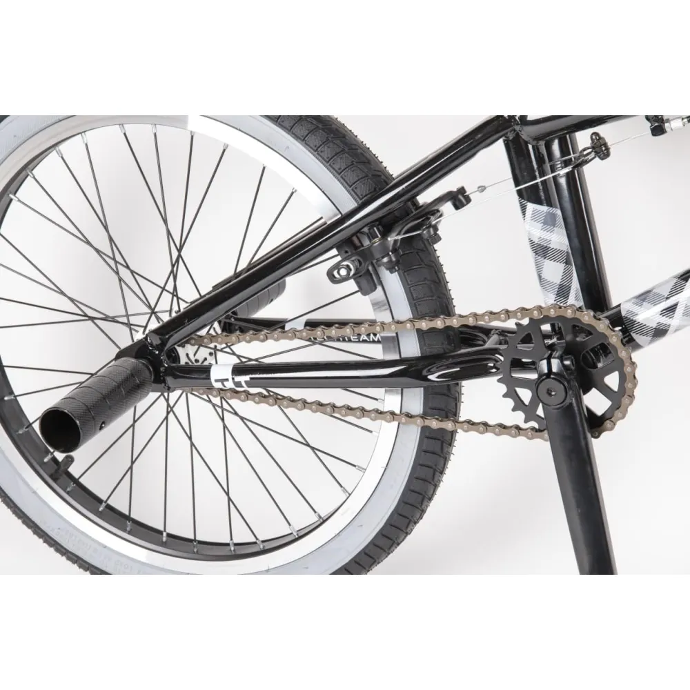 Надежная колесная часть на двойных алюминиевых ободах с накатистой резиной, брендовые покрышки, TT стальной 700 мм руль в сочетании с 4 пегами позволяют ставить трюки по рейлам и делать более серьезные манипуляции.